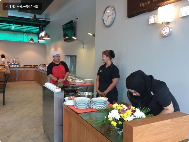 조식도 만족스러웠어요! 뷔페식으로 다양한 메뉴가 준비되어 있었는데, 특히 태국 음식들이 정말 맛있었어요. 😋 신선한 과일도 종류별로 있어서 아침부터 비타민 충전 제대로 했답니다. 🍊🍉🍍