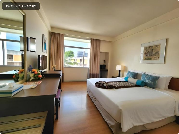 객실은 생각보다 훨씬 넓고 쾌적했어요. 침구도 깨끗하고 포근해서 잠이 정말 잘 왔답니다. 에어컨도 빵빵하게 잘 나오고, 객실 내에 TV와 냉장고, 커피포트 등 필요한 모든 것이 갖춰져 있어서 불편함 없이 지낼 수 있었어요. 🥰 특히 매일 제공되는 생수와 커피, 티백 덕분에 아침마다 티타임을 즐길 수 있었답니다. 객실 청소도 매일 깔끔하게 해주셔서 항상 쾌적한 상태를 유지할 수 있었어요. 창밖으로 보이는 푸켓 시티 뷰도 꽤 멋있었답니다.