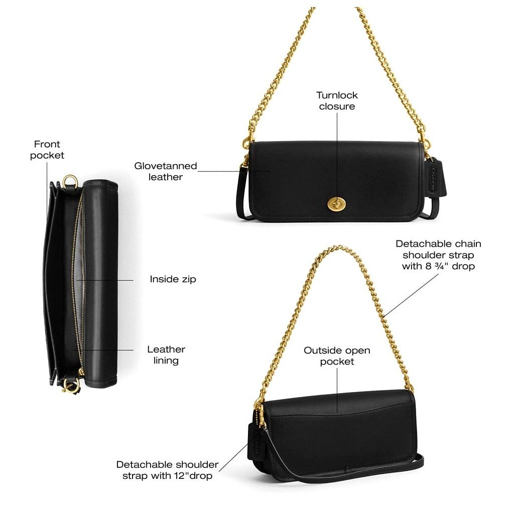 📌 솜사탕구름: 코치 딘키백 블랙 컬러 드디어 겟! 가죽 질감 진짜 부드럽고 고급스러워요. 턴락 잠금도 예쁘고, 체인 스트랩이랑 가죽 스트랩 둘 다 있어서 스타일링하기 너무 좋네요. 크기도 딱 필요한 것만 들어가서 데일리백으로 최고!