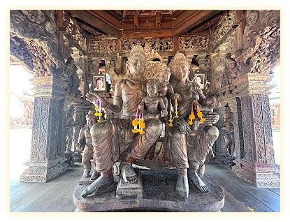 성전에 들어서는 순간, 저는 마치 다른 세계에 온 듯한 느낌을 받았어요. 사방을 둘러싼 나무 조각들은 힌두교, 불교, 태국 신화 속 인물과 상징들을 표현하고 있었는데, 그 의미를 하나하나 알아가는 재미가 쏠쏠했어요. 특히 창조, 유지, 파괴라는 삶의 순환을 나타내는 조각들은 깊은 인상을 남겼답니다. 복잡하게 얽혀있는 조각들을 바라보며 삶의 의미에 대해 다시 한번 생각해보는 시간을 가질 수 있었어요.